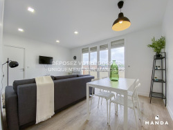 Le séjour aménagé en deux parties avec un coin salon composé d'un canapé 3 places convertibles, un tapis, une table basse, un meuble télé, un écran plat mural, un fauteuil, des étagères métalliques. Le coin salle à manger dispose d'une table et ses 4 chaises. La porte-fenêtre de la pièce principale est grande et donne accès à un large balcon avec vue sur la résidence.