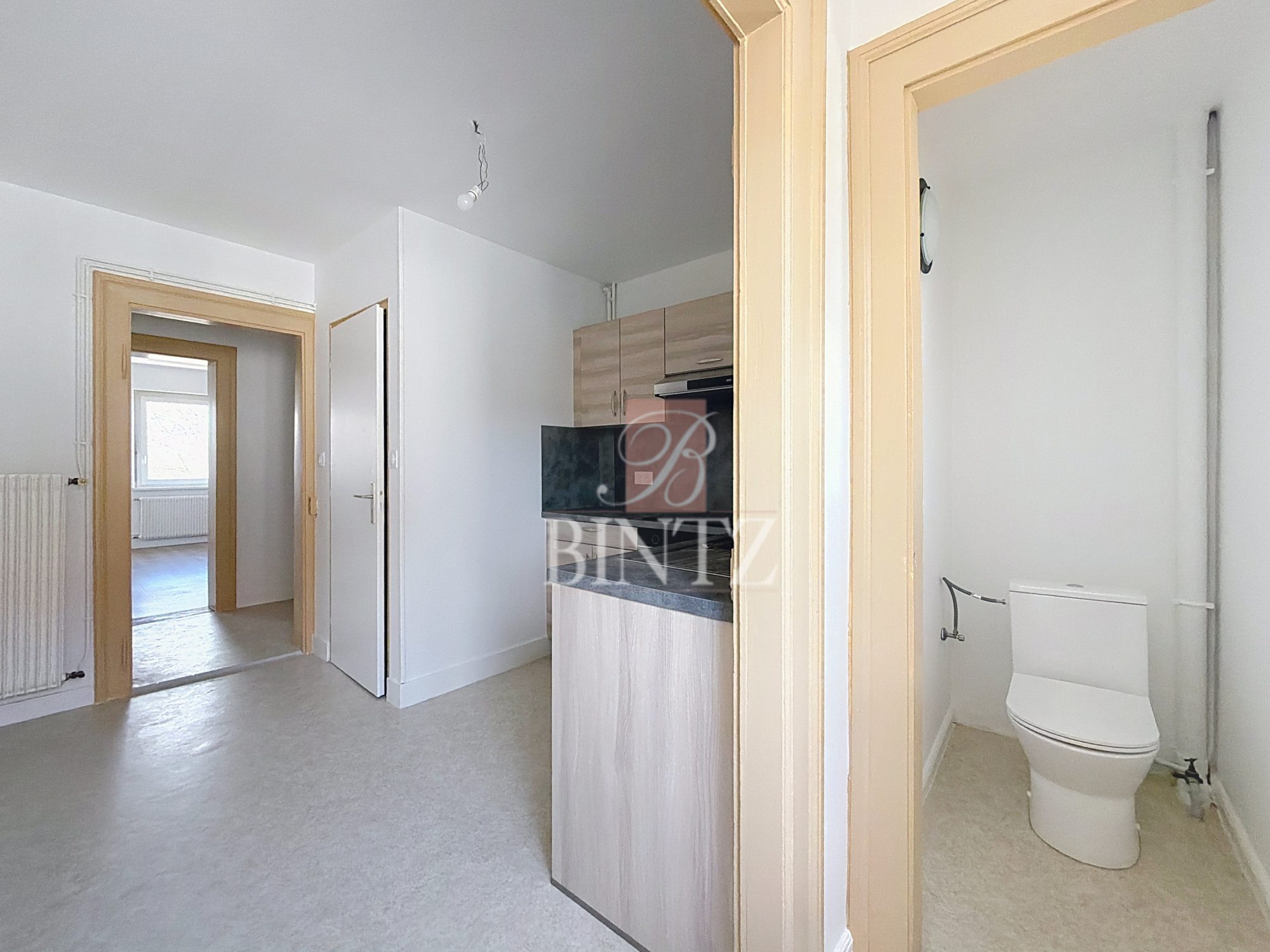 Strasbourg Cronenbourg - 13 rue Saint-Florent Au calme, spacieux 2 pièces de 62m² en rez de chaussée surelevé comprenant une entrée, un séjour et une chambre de 18 et 19m², une salle d'eau avec douche et wc , une cuisine séparée non équipée avec un balcon permettant l'accès au jardin partagé Une cave - Chauffage et eau chaude individuels gaz