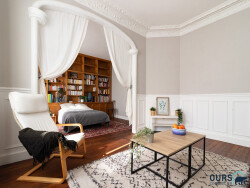 Amateurs d'ancien, voici de quoi vous ravir ! Hauteur sous plafond, cheminées, moulures, ornements muraux, rosaces, grandes fenêtres et parquet massif. Ce très charmant 4 pièces de près de 70 m² au cachet intérieur véritable vous attend avec impatience ! A SAINT-DENIS, dans une petite rue discrète et bien située, dans un immeuble de caractère à la belle façade de brique construit en 1910. Baigné de lumière grâce à son orientation plein Sud et à ses nombreuses ouvertures, son agencement est vraiment agréable : il se compose d'une entrée distribuant d'un côté un beau séjour et une chambre de taille équivalente pourvue d'une superbe bibliothèque. Ces deux pièces peuvent également se présenter sous la forme d'une grande et spacieuse pièce de vie. Une cuisine aménagée au côté 'brocante' devrait plaire aux chineurs. Une grande pièce actuellement à usage de bureau (Psst ! C'est pour vous, les télétravailleurs) et chambre d'amis mène vers la chambre principale dotée de grands et profonds rangements. Enfin, une salle d'eau avec WC dotée d'une grande fenêtre, c'est appréciable, A proximité immédiate du théâtre Gérard Philipe, à 10 minutes du métro Basilique et de la gare de SAINT-DENIS (reliant PARIS Gare du Nord en 6 min). Le Canal de Saint-Denis et de sa piste cyclable vers Paris, tout proche, Le plus: une copropriété où la bonne ambiance règne, parfaitement entretenue et très bien gérée . Un DPE en D, une cave saine et spacieuse et la possibilité de garer son vélo dans la cour intérieure ! Visite virtuelle immédiate. Nos photos sont des prises de vue REELLES et donc NON générées par l'IA.