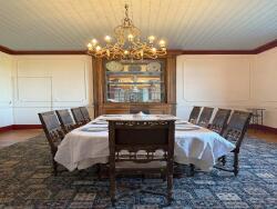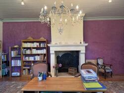 Cette pièce, qui s'étend sur toute la largeur de la maison, organise le rez-de-chaussée en deux ailes distinctes. D'un côté se trouvent l'ancienne porte d'entrée, aujourd'hui rarement utilisée, et une vaste suite au rez-de-chaussée. De l'autre, trois pièces de réception supplémentaires, dont un petit salon et une salle à manger formelle. Cet espace fait face à une seconde grande terrasse, avec des vues dégagées sur les collines boisées.