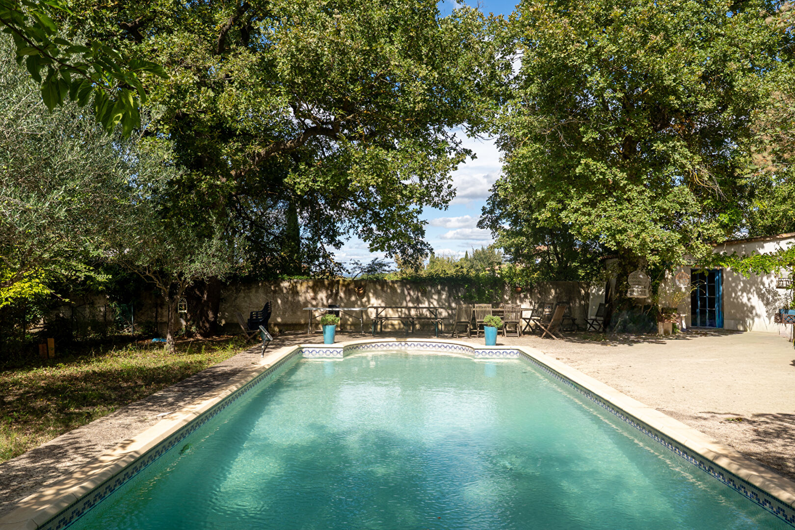 A l'extérieur, la piscine chauffée, le potager et les vastes espaces arborés offrent un cadre idyllique. La propriété est raccordée au réseau d'eau potable et bénéficie en complément d'un forage et d'un puits.