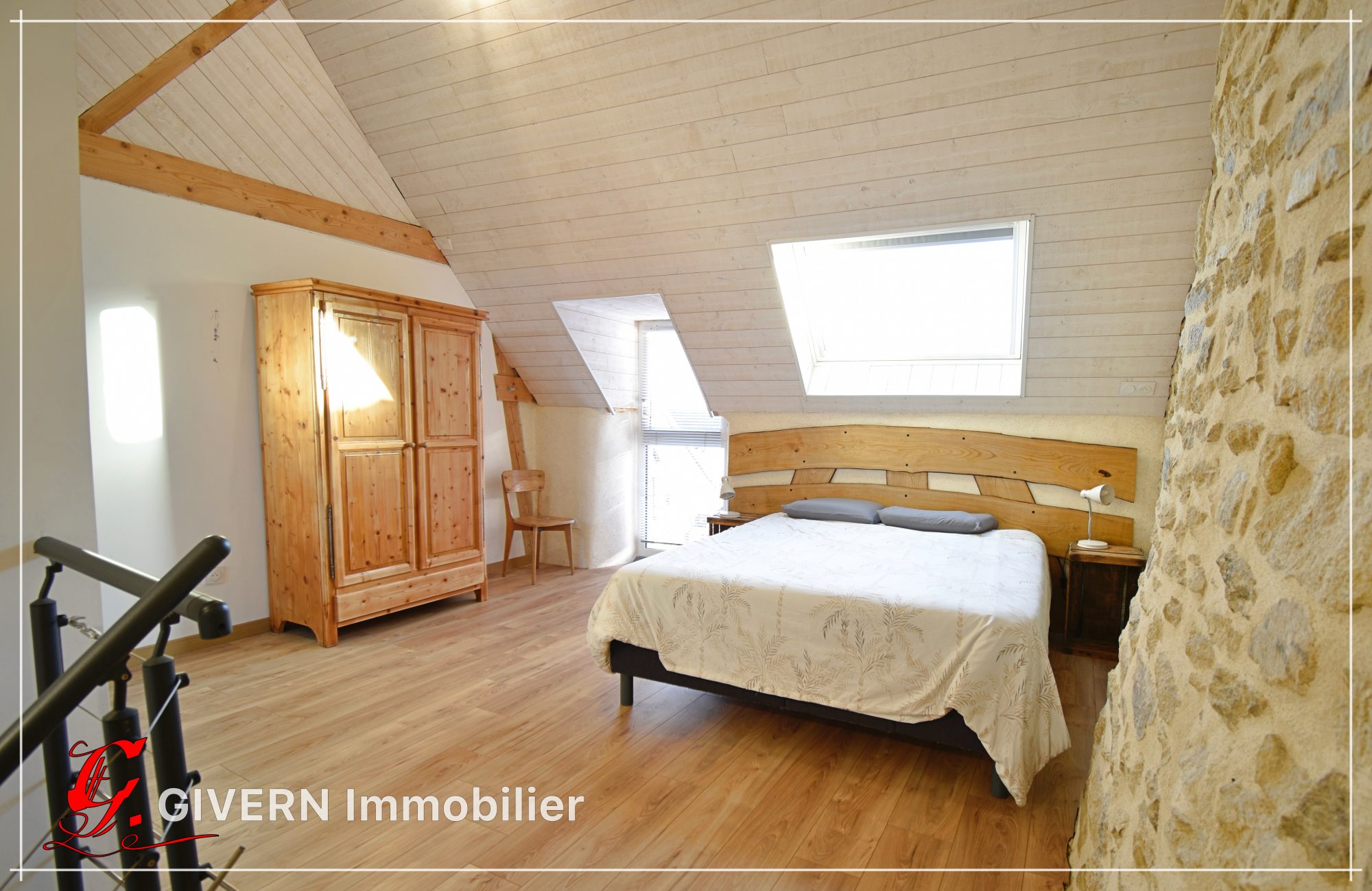 L'étage dessert une chambre, un grand bureau, une salle d'eau, un WC et une mezzanine.