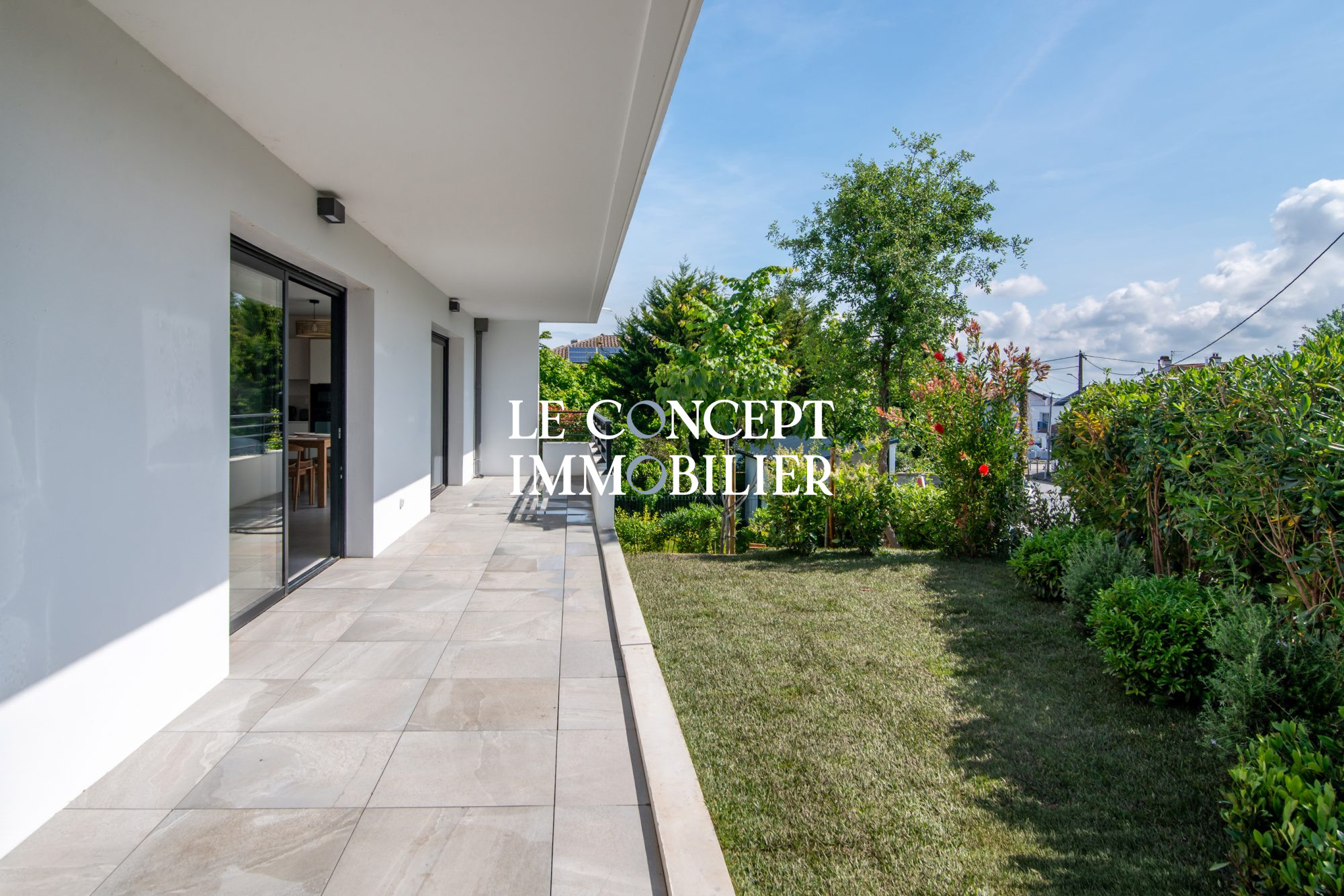 Belle hauteur sous plafond pour la pièce à vivre largement ouverte sur la terrasse et composée d'un salon, d'une salle à manger et d'une cuisine ouverte alliant confort et convivialité.