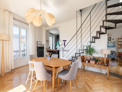Rare! Aigle/Jaurès, en dernier étage, très beau duplex de 136m² rénové avec beaucoup de goût et bénéficiant d'une très jolie vue. Sa configuration en fait véritablement un appartement familial : une grande pièce de vie salon / salle à manger / cuisine ouvrant sur deux balcons, 4 chambres dont 1 à l'étage, buanderie, 1 salle de bains, 1 salle d'eau et 1 WC indépendant. L'appartement est traversant et baigné de lumière grâce à son exposition en pignon Est/Sud/Ouest. Le marché de l'Estacade est au pied. La gare, les transports en commun et les écoles sont à proximité immédiate. Présence d'une cave et d'un local à vélos. A visiter sans tarder!