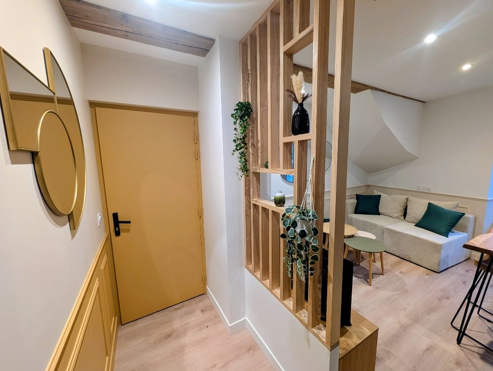 Traversant et particulièrement lumineux, cet appartement se compose d'un séjour, d'une salle à manger ( ou possibilité séjour et 2 chambres), d'une cuisine semi-ouverte entièrement équipée, ainsi que d'une chambre aménagée en mezzanine à l'étage.