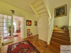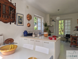 Propriété lumineuse en vente à Dinard la vicomté. L'Agence immobilière Le Dôme vous présente cette maison en pierres, située dans un quartier calme et arboré de Dinard, perle de la Côte d'Émeraude. Cette propriété de 163m2 séduit par ses volumes, son agencement fonctionnel et son beau jardin. Le sentier de randonnée qui longe la côte et les jolies criques sont accessibles en moins de cinq minutes à pieds. Situation idéale pour profiter du bord de mer sans les inconvénients de la foule estivale ! Au rez-de-chaussée: belle entrée, WC avec lave-mains, dressing, vaste salon-séjour lumineux ouvrant sur une terrasse bien exposée, grande cuisine aménagée et équipée. - Possibilité de créer une chambre au rez-de-chaussée selon vos besoins. À l'étage, le palier distribue quatre chambres, dont une suite parentale avec salle de bain privative et une seconde chambre avec salle d'eau privative. Un WC indépendant et un dressing complètent ce niveau. Pour votre confort, le sous-sol complet offre un garage pour deux voitures, une cave et une buanderie. Le tout sur un beau terrain clos de 936 m2, dans un environnement paisible et verdoyant. Informations sur les risques disponibles sur www.georisques.gouv.fr