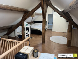 Au premier étage, passé le SAS, vous découvrirez une pièce à vivre de 44 m2 double exposition Est-Ouest avec un poêle à bois, cuisine ouverte; et une chambre avec salle d'eau et WC (petite suite). Au second, une grande chambre avec un partie bureau et une salle de bain avec WC.