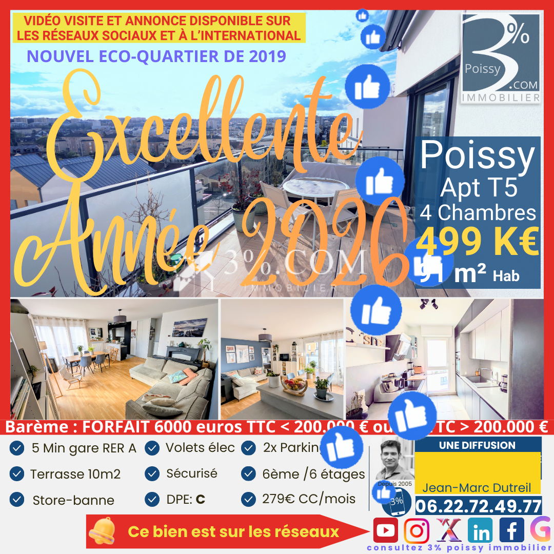 3% Poissy vous présente ce DUPLEX 4 CHAMBRES REFAIT A NEUF au 1er et 2ème étage dans une copropriété située à 2 minutes de la gare et Tramway T13 et du centre ville de Poissy : Au 1er niveau : - Entrée -Cuisine fermée meublée/équipée -Une chambre -Une salle de bains/Buanderie -WC séparé -Salon/Séjour/Salle à manger de 37m2 Au 2ème niveau : - 3 GRANDES CHAMBRES dont une avec BALCON -Salle de bains -WC Séparés 2 GRANDS BOX et 2 CAVES complètent ce bien. Eau Froide et Chauffage inclus dans les charges 450 euros/mois Taxe Foncière 2820 euros 7 Lots d'habitation dans la copropriété. Honoraires réduits et déductibles sur ce logement avec 3%.COM Poissy immobilier. N'hésitez pas à me contacter pour plus de renseignements. JEAN MARC DUTREIL 3% Poissy immobilier Joignable au 06.22.72.49.77 RETROUVEZ TOUTES NOS ANNONCES sur : www.troispourcent.com www.poissy-immobilier.fr www.troispourcent-prestige.com Et sur la plupart des meilleurs sites immobiliers nationaux. Compétences et juste prix, le meilleur des compromis c'est ici. __ -- __ -- __ -- __ -- __ -- __ -- __ -- __ -- __ -- __ -- __ -- VOUS VENDEZ OU ALLEZ VENDRE PROCHE POISSY ? Des PRESTATIONS de vente UNIQUES EN FRANCE et à coûts réduits. * Contactez Jean-Marc Dutreil 06.22.72.49.77 pour 3%.com Poissy immobilier & Prestige Yvelines Properties (Réseau national à honoraires réduits 3% TTC déductibles) * Agent immobilier depuis 2005, SPÉCIALISÉ POISSY ET SES ENVIRONS * RSAC de Versailles 47964730700038 * Les informations sur les risques auxquels ce bien est exposé sont disponibles sur le site Géorisques : www.georisques.gouv.fr VIDEO DU BIEN DISPONIBLE SUR LES RESEAUX SOCIAUX - Annonce rédigée et publiée par un Agent Mandataire -