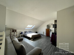 Situés au 3ème et dernier étage de l'immeuble, l'appartement est en duplex, distribué de la sorte : Une entrée avec placard desservant la salle de bain avec WC et le séjour. Séjour lumineux et coin cuisine. A l'étage, une grande chambre avec placard, au calme.