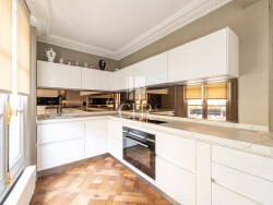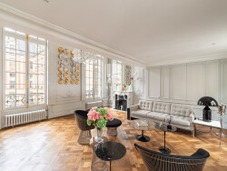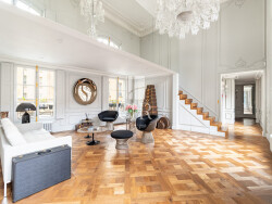 La vaste pièce de réception, sublimée par un parquet Versailles, des moulures et staff réalisés par Auberlet & Laurent, s'organise autour d'une cheminée d'époque et est magnifiée par des luminaires Baccarat, collection Zénith by Starck. La cuisine dînatoire sur mesure, entièrement équipée d'un électroménager professionnel Gaggenau, Miele et Neff, s'intègre harmonieusement dans cet ensemble élégant et fonctionnel. La partie nuit propose deux chambres, dont une superbe suite principale au second niveau avec espace bureau sur mesure, dressing aménagé et vaste salle de bains en marbre avec douche à l'italienne. Une seconde chambre avec sa salle d'eau permet de recevoir en toute indépendance. La configuration de l'appartement permet également la création d'une troisième chambre si nécessaire.