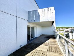 Rouen les Docks Appartement duplex de 110 M2 au dernier étage ascenseur parking, Balcon et Terrasse dans résidence récente de 2015 avec vue dégagée seine et cathédrale, grand séjour salon avec cuisine, 3 chambres, salle de bains, salle de douche, lingerie, dégagement 2 wc baigné de lumiere, pas de travaux a prevoir DPE en A, chauffage collectif, charges 250 /mois