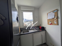 La cuisine, ouverte sur le séjour et donnant accès au balcon, est aménagée et équipée de plaques de cuisson, hotte, four et lave-vaisselle. Fonctionnelle et agréable, elle offre un espace idéal pour cuisiner au quotidien.