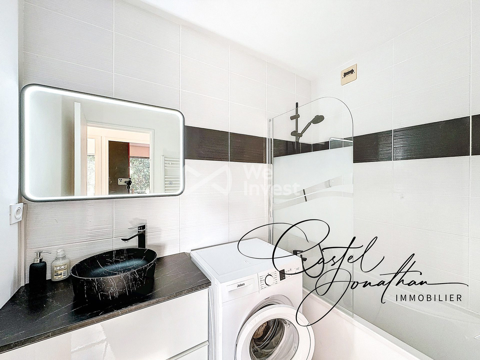 La salle d'eau comprend une douche ainsi qu'un meuble vasque. Un emplacement est prévu pour l'installation d'une machine à laver, apportant un confort supplémentaire au quotidien.