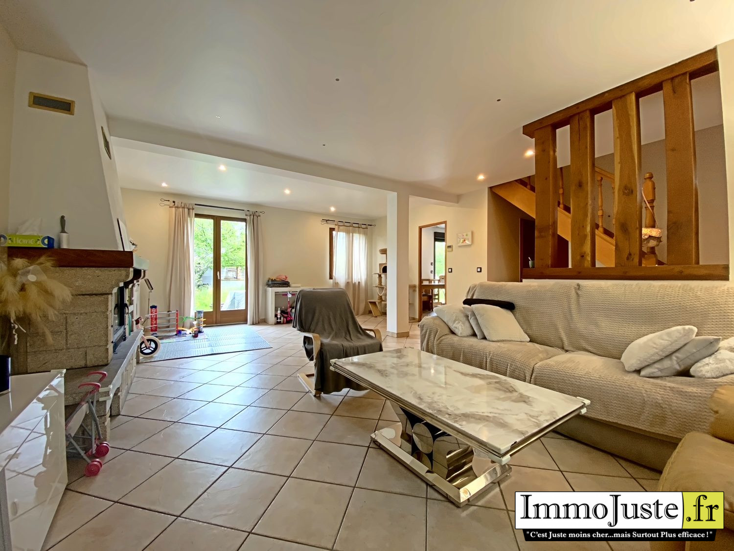 Au RDC, une pièce de vie de 42 m2 triple exposition avec cheminée et accès sur terrasse exposée Ouest, une cuisine toute équipée, une chambre avec grands placards et une salle d'eau avec WC. A l'étage, un palier dessert 3 chambres et une salle d'eau avec WC.
