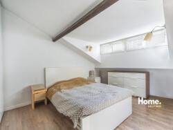 Le séjour révèle de beaux volumes sous les toits, ponctués de poutres apparentes et de fenêtres en enfilade diffusant une lumière douce tout au long de la journée. L'ensemble dégage une atmosphère paisible et singulière.