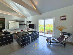 Cette propriété d'inspiration provençale moderne déploie trois niveaux desservis, par un ascenseur, tous conformes aux normes PMR, offrant des volumes généreux et une architecture soignée au sein d'un écrin de verdure de plus de 4 hectares avec étang et prestations haut de gamme. Les pièces de vie du niveau principal sont déplafonnées, révélant une élégante charpente apparente en sapin massif, apportant cachet et luminosité. Vous y décroirez : Un séjour chaleureux agrémenté d'une cheminée avec insert intégrée dans la cloison. Une cuisine haut de gamme entièrement équipée (réfrigérateur américain, four pyrolyse, induction, micro-ondes, grill, chauffe-plats, hotte à évacuation) accompagnée d'un cellier aménagé. Une arrière cuisine et une buanderie avec toutes les prestations nécessaires y compris un évier. Un WC suspendu avec lave-mains ainsi qu'un urinoir suspendu. La partie nuit offre des espaces indépendants et raffinés : Une suite parentale avec dressing séparé, salle d'eau (double vasque, baignoire, douche italienne), WC. Une seconde chambre avec dressing, salle d'eau privative (douche italienne) et WC. Une troisième chambre à ce niveau complète les prestations À l'étage :