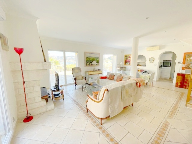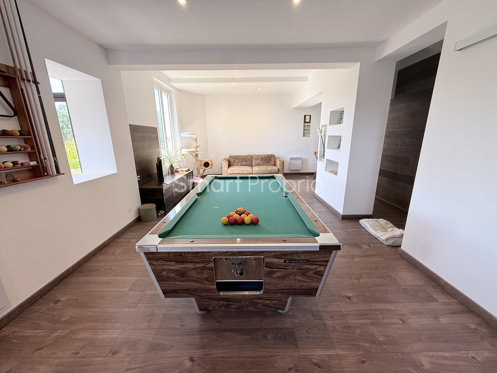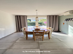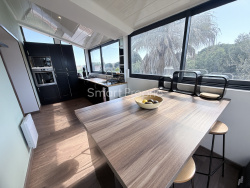 Dès l'entrée, un espace fonctionnel avec rangements et cellier. La pièce de vie lumineuse de 30 m2, climatisée et équipée d'un poêle à granulés. Le séjour s'ouvre sur une grande terrasse de 100 m2.