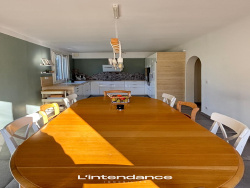 La cuisine aménagée et équipée, prolongée par une salle à manger de 21 m2.