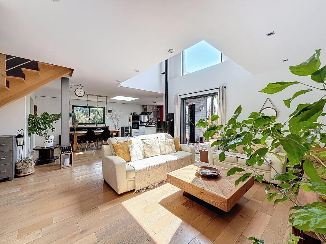 Dès l'entrée, vous serez séduits par un vaste séjour lumineux de 44 m², une pièce traversante agrémentée d'une cheminée à foyer fermé, idéale pour des soirées cocooning et avec un accès direct aux deux terrasses de la maison.