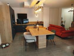 L'intérieur de l'appartement allie confort et fonctionnalité. Le séjour s'ouvre sur une cuisine entièrement équipée avec des matériaux de qualité et des finitions soignées. Deux chambres confortables permettent un aménagement agréable, tandis que la salle de bain intègre un espace astucieux pour la machine à laver et des rangements pratiques. Les WC sont séparés pour plus de confort.