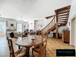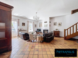Derrière sa façade discrète qui s'inscrit harmonieusement dans le bâti ancien du village, la maison offre 200m2 habitables répartis sur deux niveaux.