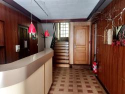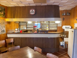 Hall d'accueil, sanitaires, bar et ancienne salle de restaurant aujourd'hui aménagée en cuisine équipée,