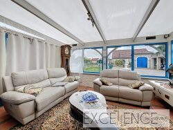 Le rez-de-chaussée s'organise autour d'un vaste espace de vie central, réunissant un séjour chaleureux et une cuisine fonctionnelle et conviviale. L'ensemble est prolongé par une véranda et une pergola, permettant d'étendre naturellement les espaces de vie vers l'extérieur.