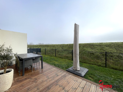 Jardin clos et engazonné Terrasse en bois de 14 m2 Garage indépendant de 15 m2, équipé de lumière, de prises électriques et d'un accès direct au jardin.