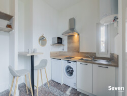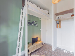 Studio de 14 m2, au 2ème étage sans asc., entièrement meublé et équipé. Pièce de vie, cuisine, rangement, lit mezzanine, salle de bains avec wc. Canapé lit convertible