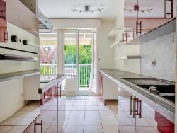 Séjour salon avec cuisine ouverte de 31 m2 donnant sur balcon de 8 m2, chambre de 10 m2, salle de douche, WC et son garage individuel en sous-sol.