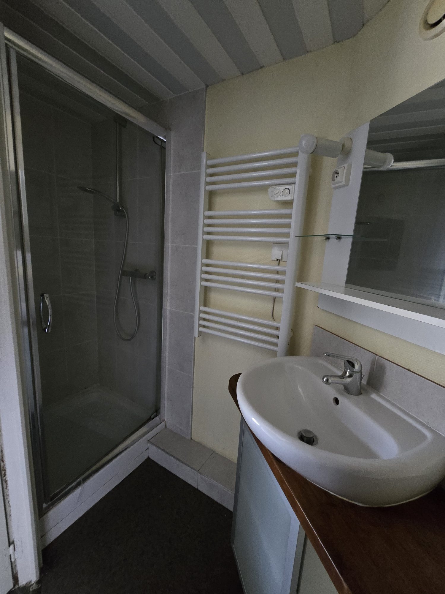 EVREUX CENTRE VILLE, proche du cinéma, studio de 20 m² en rez de chaussée avec terrasse et cour commune comprenant : entrée dans cuisine aménagée et équipée d'une plaque de cuisson vitrocéramique et d'une hotte aspirante, salle de douche avec wc, pièce principale avec des étagères. Fenêtres double vitrage avec volets roulants électrique. chauffage individuel électrique, eau froide collective et edf individuelle.