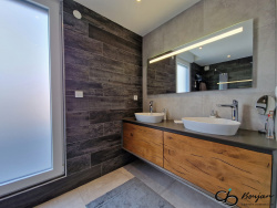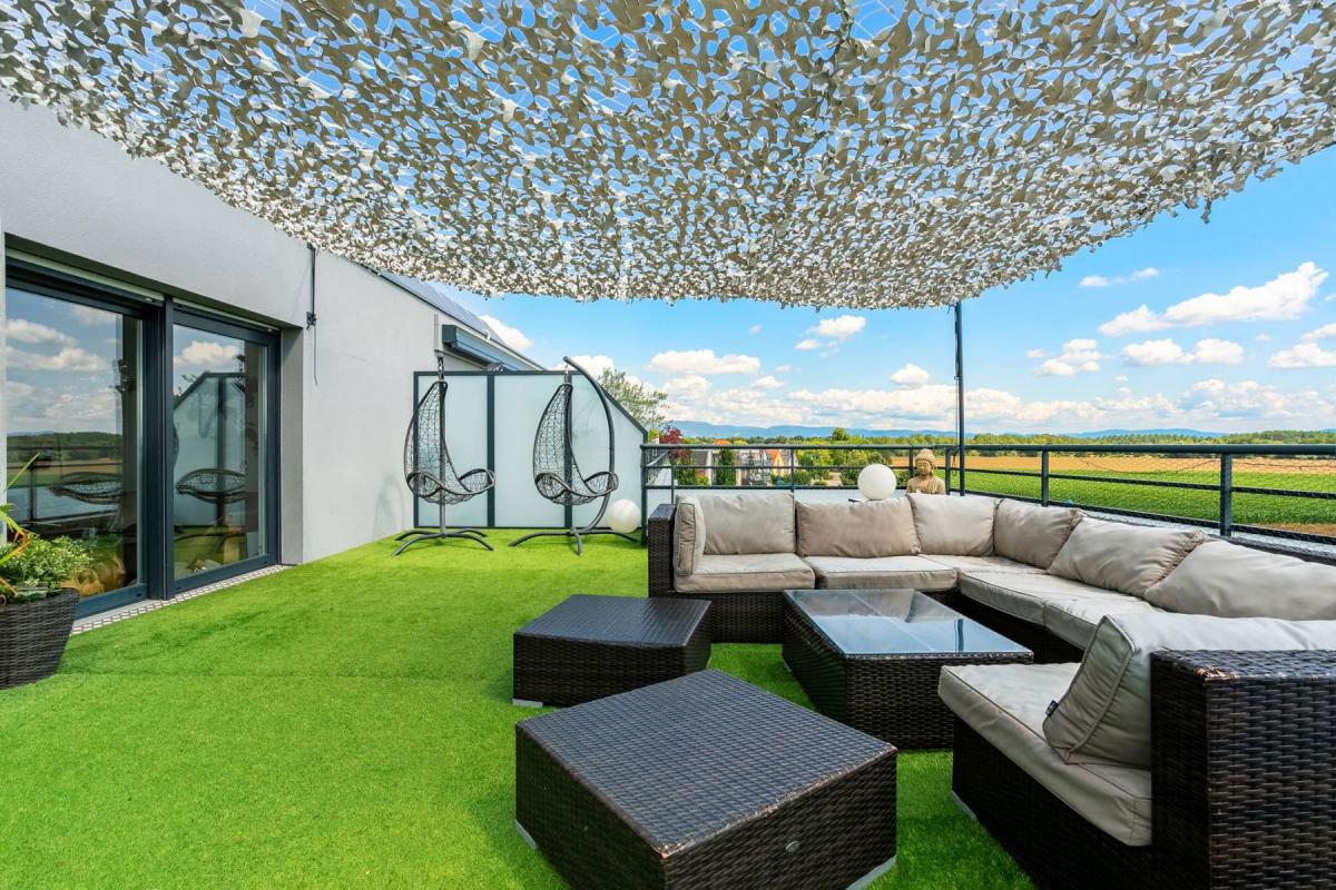 Évoquons enfin la terrasse paysagée de 70 m2, avec une vue à 180o sur la verdure et les environs, sur laquelle vous pourrez profiter en toute discrétion de chaudes journées ensoleillées...