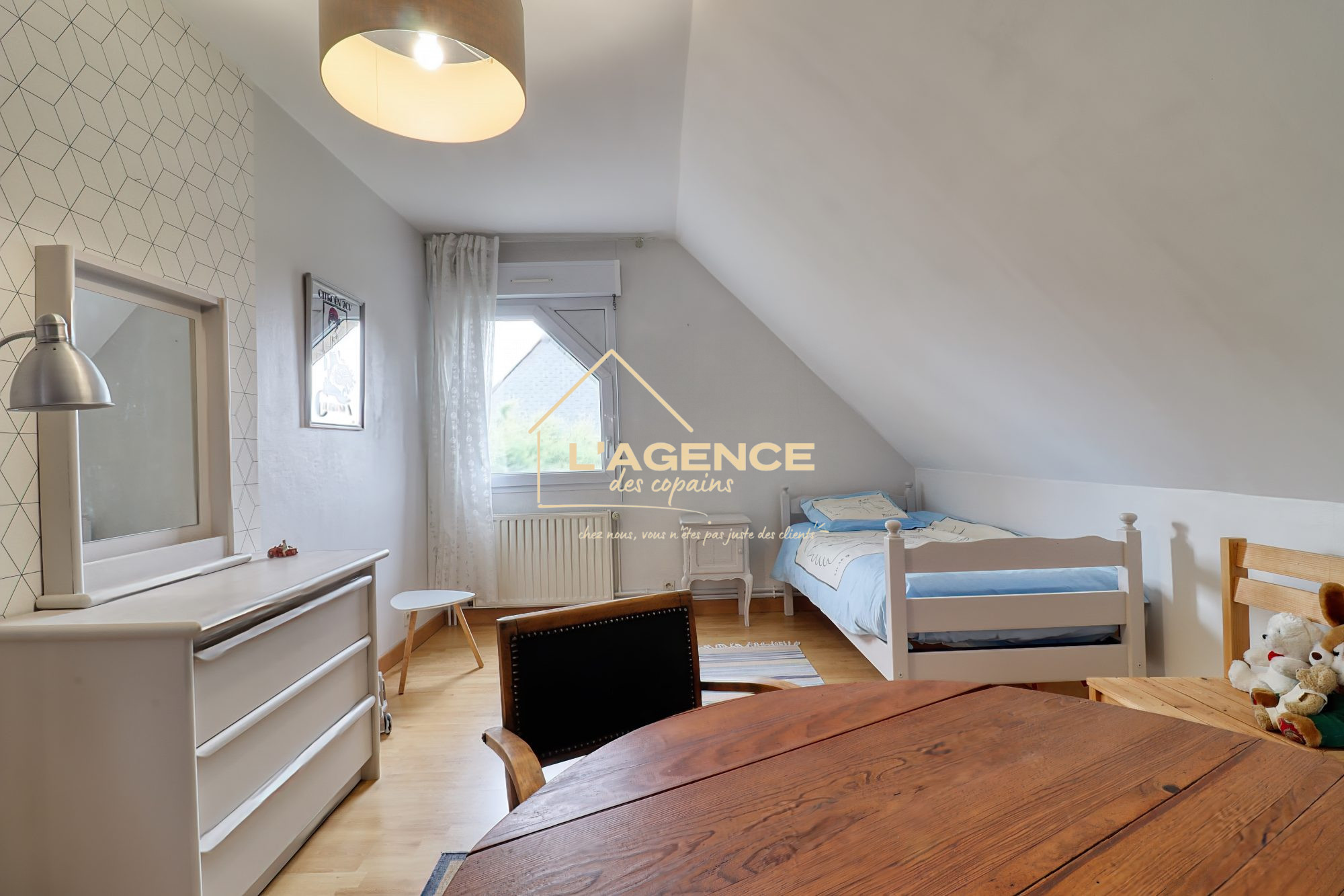 Elle offre un espace de vie de 46m2, une cuisine équipée, quatre chambres dont deux à l'étage, deux pièces d'eau, un bureau, un dressing et un garage.
