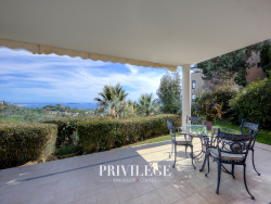 En exclusivité, Niché sur les hauteurs très prisées de Mandelieu, au coeur du prestigieux domaine sécurisé du Grand Duc, cet appartement de 4 pièces en rez-de-jardin se distingue par ses prestations haut de gamme : piscine, courts de tennis et club de fitness. Avec une superficie généreuse de 104 m2, ce bien rare offre un cadre de vie alliant raffinement et sérénité. Sa vaste terrasse couverte de 51 m2 et son jardin paysager privatif s'ouvrent sur une vue panoramique exceptionnelle embrassant la mer, la baie des Îles de Lérins et les collines de mimosas. L'agencement intérieur a été pensé pour un confort absolu : un hall d'entrée spacieux, un séjour lumineux de 32 m2, une cuisine indépendante aménagée, deux chambres avec leur salle d'eau privative, ainsi qu'une suite parentale d'exception avec vue mer, dressing, salle de bain raffinée et WC privatifs. Un toilette invité complète cet espace élégant, où chaque détail a été conçu pour conjuguer intimité et art de vivre. Un garage fermé et une cave complètent ce bien d'exception. Idéalement situé, à seulement 35 km de l'aéroport international de Nice et à quelques minutes des commodités, il réunit toutes les qualités d'un lieu unique. Un véritable joyau, destiné aux amoureux de vues à couper le souffle et de tranquillité absolue.