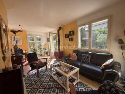 Dès l'entrée, vous serez séduit par la luminosité de la pièce de vie, mise en valeur par de grandes ouvertures qui laissent entrer la lumière. La hauteur de la maison renforce cette impression d'espace et de liberté. L'atmosphère y est particulièrement chaleureuse, notamment grâce à un poêle à bois central qui fait de cet espace un lieu de vie convivial et accueillant. Une porte-fenêtre permet un accès direct à une grande terrasse ensoleillée et au jardin entièrement clos, planté d'arbres et de fruitiers.
