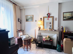 Un séjour avec tomettes et cheminée décorative, idéal pour créer une ambiance chaleureuse.