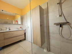 Au demi-étage: - Un hall - 3 chambres - Une salle de douche (douche bac extra-plat + meuble double vasques + miroir + sèche serviette + faïence) - Un wc suspendu