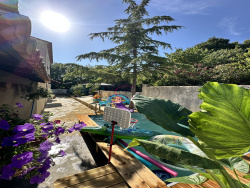 Extérieurs soignés : Une magnifique terrasse donnant sur une piscine intimiste.