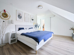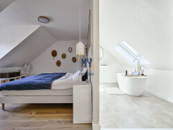 À l'étage : Un grand palier aménagé en espace bureau et avec vue plongeante sur le séjour, dessert deux chambres confortables, une salle de douche moderne avec douche à l'italienne et meuble vasque, ainsi qu'un WC séparé. Enfin, un grand dressing précède une belle suite parentale dotée de sa propre salle de bains avec baignoire îlot, créant un véritable espace intime et chaleureux.