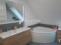 A l'étage (dalle béton), le palier dessert une salle de bain (meuble vasques, baignoire, douche italienne) et 4 grandes chambres dont une avec dressing.