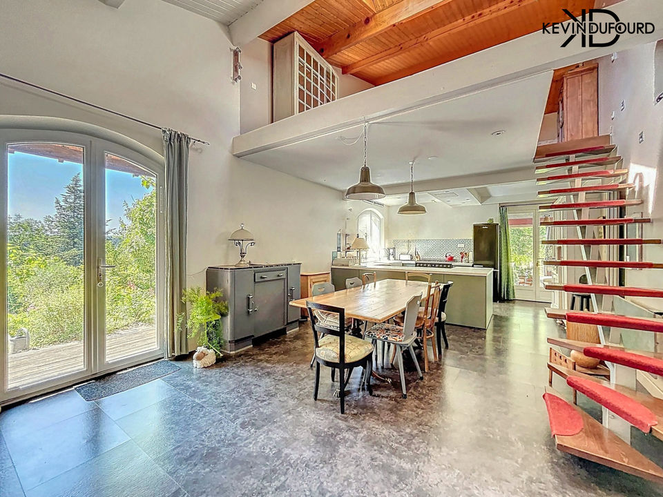 Nichée dans un hameau, cette propriété à vendre est une véritable perle rare. Singulière à bien des égards, cette maison offre un potentiel exceptionnel. Une fois les travaux de rénovation achevés, elle deviendra sans nul doute un véritable havre de paix, propice au calme et à la sérénité. Perchée sur les hauteurs d'une colline, elle bénéficie de vues panoramiques variées et remarquables depuis chacune de ses pièces, offrant ainsi une expérience visuelle unique à tout moment de la journée. La maison principale propose une vie de plain-pied avec une chambre et une salle de bains au rez-de-chaussée. À l'étage, trois chambres supplémentaires complètent l'espace nuit. L'espace de vie, spacieux et chaleureux, se divise entre un salon avec cheminée et une salle à manger lumineuse prolongée par une terrasse. Une mezzanine d'environ 12 m² surplombe la salle à manger et offre un coin paisible idéal pour un bureau, un coin lecture ou un espace détente. À l'extérieur, plus de deux hectares de terrain s'offrent à vous, dont 8 000 m² directement attenants à la maison. Le reste se compose de terres agricoles. Un vaste garage en sous-sol, occupant toute la surface de la maison, vient compléter les prestations. Et ce n'est pas tout : une magnifique grange en pierre, à rénover, surplombe la vallée avec une vue à couper le souffle. Elle peut être transformée en gîte, atelier, salle de sport ou tout autre projet selon vos envies. Des travaux de rénovation intérieurs sont à prévoir, mais le potentiel est immense. Un lieu à découvrir sans tarder pour les amoureux d'authenticité, de nature et de tranquillité. Les + : vue, grange en pierre, situation