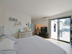 Le rez-de-chaussée se compose d'un séjour/cuisine (equipée) ouvert d'environ 45m2, un wc, une buanderie et une magnifique suite parentale de 30m2 avec dressing et salle de bains (douche et baignoire) ainsi qu'un garage de 25m2. Le tout desservant la terrasse et la piscine exposés plein sud. A l'étage, 2 chambres, une grande salle d'eau avec double vasque.