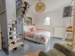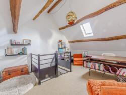 Mais la cuisine vous conduit aussi à la chambre d'amis et à sa bibliothèque sur mesure, en bois de hêtre?Et à l'étage, où vous trouverez encore deux chambres spacieuses avec combles cathédrales, et une salle de bain.