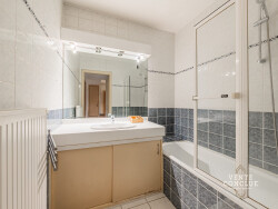 Deux chambres à coucher (12,7 et 13,9 m²), une salle de bain carrelée toute hauteur avec baignoire équipée d'un pare-douche, meuble sous vasque avec rangements, miroir et spots intégrés, ainsi que des WC séparés et plusieurs placards de rangement complètent l'ensemble.