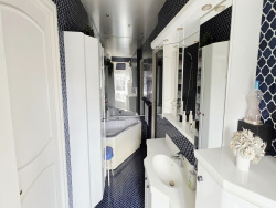 Hall d'entrée majestueux avec escalier cathédrale et sol en marbre travertin espagnol Sanitaires haut de gamme façon hôtel de luxe Bureau ou chambre avec salle de bain attenante Spacieuse pièce de vie avec cheminée en pierre à feu de bois Salle à manger lumineuse ouverte sur cuisine aménagée et équipée avec matériaux nobles Accès à une véranda baignée de lumière avec vue sur le jardin
