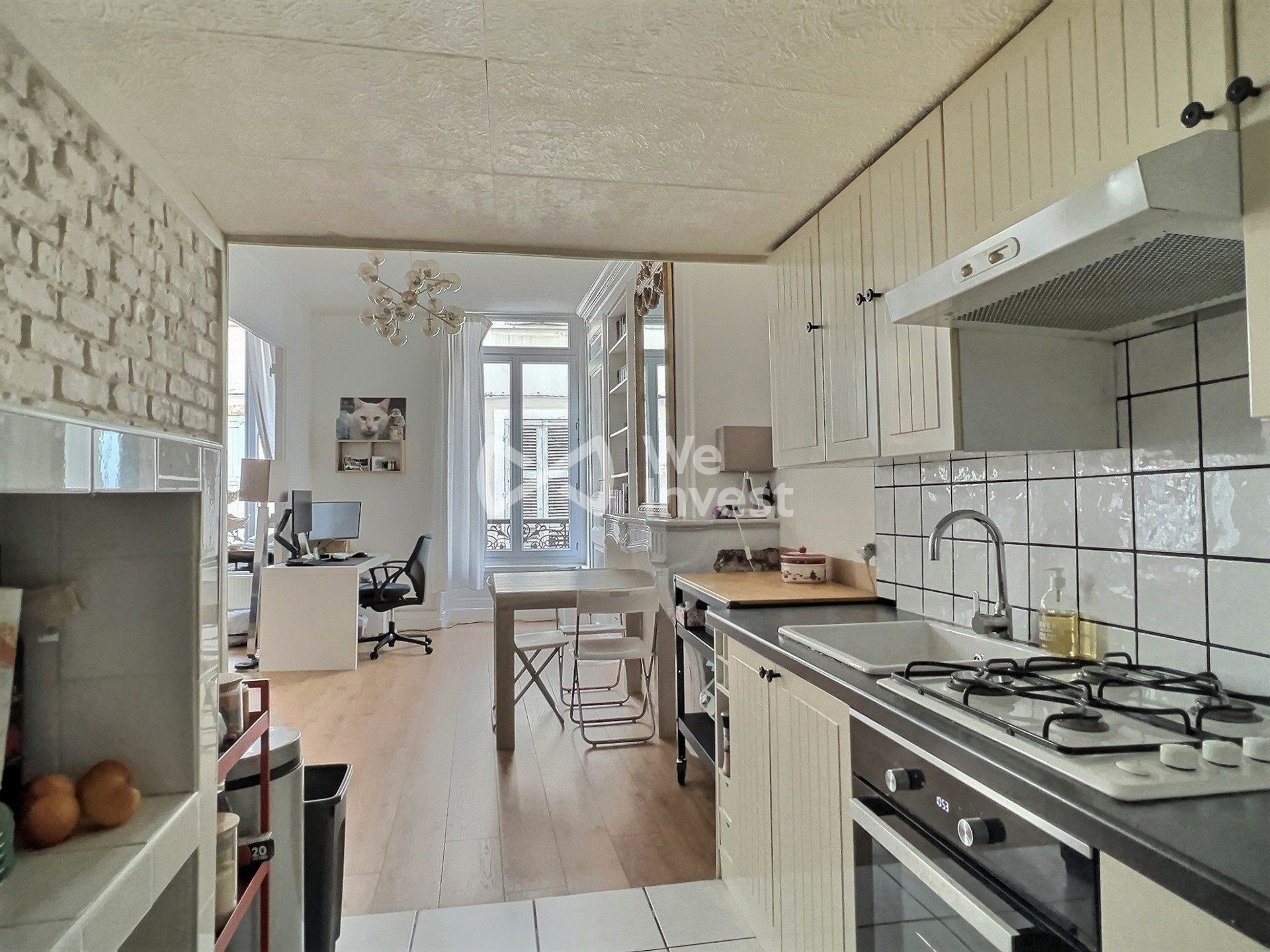 La cuisine est aménagée d'éléments hauts et bas et équipée (plaque de cuisson au gaz neuve, four, hotte). Vous disposerez également d'une loggia vous permettant de disposer d'un lieu supplémentaire de stockage.