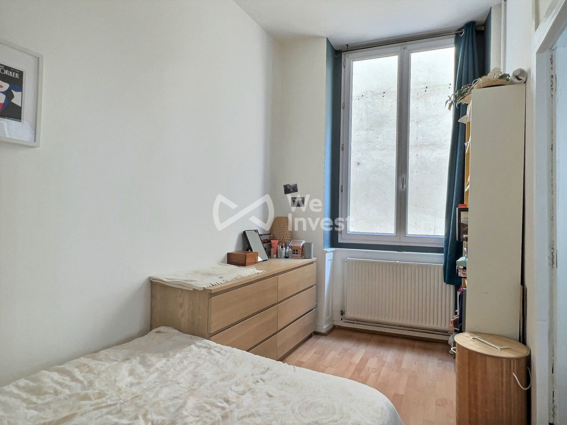 La chambre est lumineuse, spacieuse. Vous pouvez aisément aménager un coin bureau sans rajouter de meuble de rangement. En effet la chambre est dotée de 2 grands placards muraux (penderie et étagères).