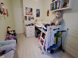 Distribution: Grande pièce de vie avec cuisine aménagée et équipée, dégagement avec placard, WC indépendant, salle d'eau avec espace buanderie et 2 grandes chambres de 11 et 13 m².