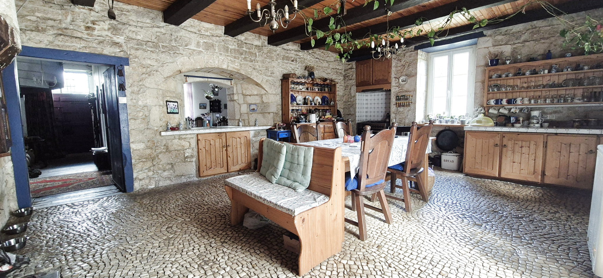 Dès l'entrée, un hall authentique et chaleureux mène à une grande pièce de vie d'environ 77 m² intégrant un espace cuisine aménagé et équipé avec piano de cuisson SMEG, ouverte sur le séjour. Un superbe four à pain en pierre vient souligner le caractère de cette pièce conviviale. Ce niveau comprend également une buanderie / cellier, un espace technique servant de chaufferie ainsi qu'un WC.