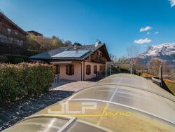 Saint-Gervais - Cupelin - Située dans une impasse calme et ensoleillée, venez découvrir cette propriété avec vue exceptionnelle sur le Mont-Blanc et les sommets alentour. Implantée sur une parcelle de plus de 1500m², la ferme se compose de 8 pièces dont 5 chambres, ainsi qu'un studio indépendant. Au rez-de-chaussée, hall d'entrée, grand salon lumineux avec cheminée, une cuisine séparée et plusieurs espaces de rangement, une chambre, salle de bains. L'étage profite d'une grande pièce avec charpente apparente, trois chambres, une salle d'eau et une salle de bains, complété par un studio indépendant. Cette propriété atypique bénéficie d'un abri voiture double et d'une piscine extérieur avec belle terrasse aménagée vue Mont-Blanc.